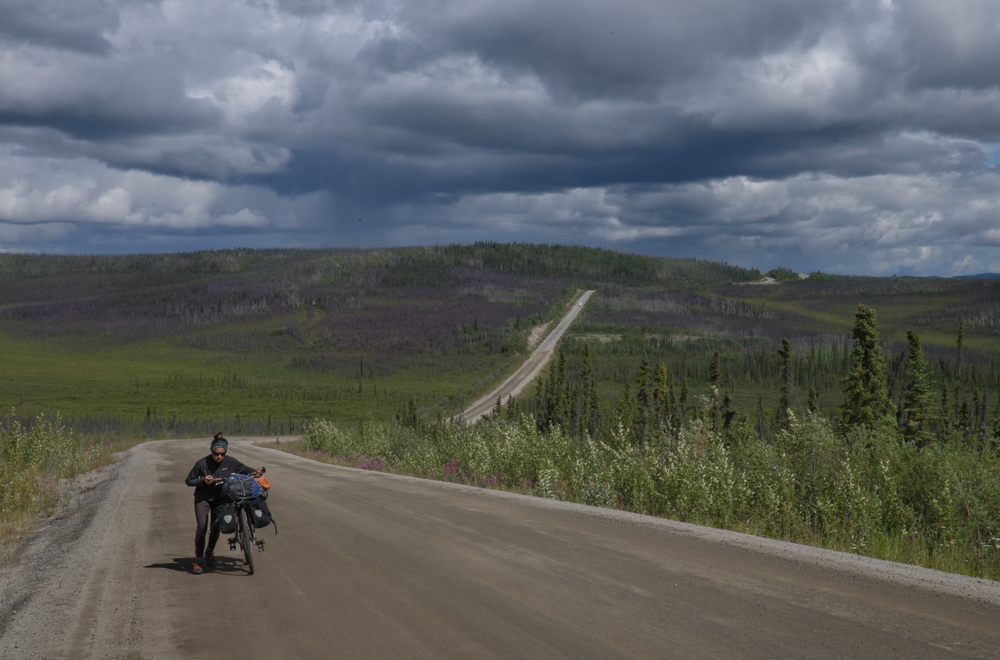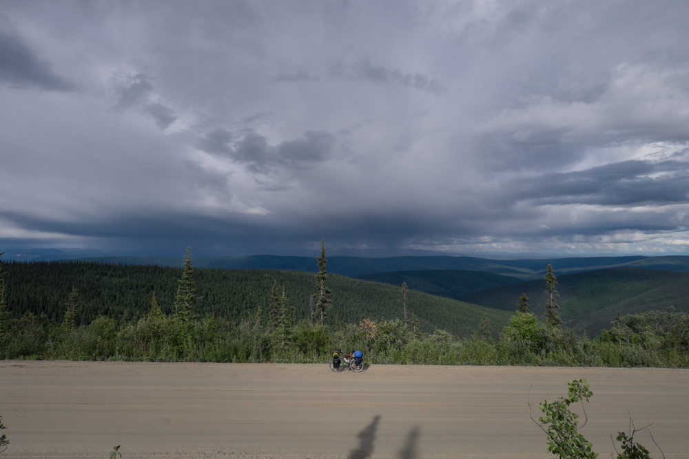 El camino de tierra sube desde la orilla del Yukón casi en línea recta hasta lo alto de las montañas durante más de 14 km. Las intensas lluvias de los días anteriores han convertido el camino en un barrizal y nuestras bicicletas, pesadas y patosas, se pegan al terreno haciendo del ascenso algo penoso.