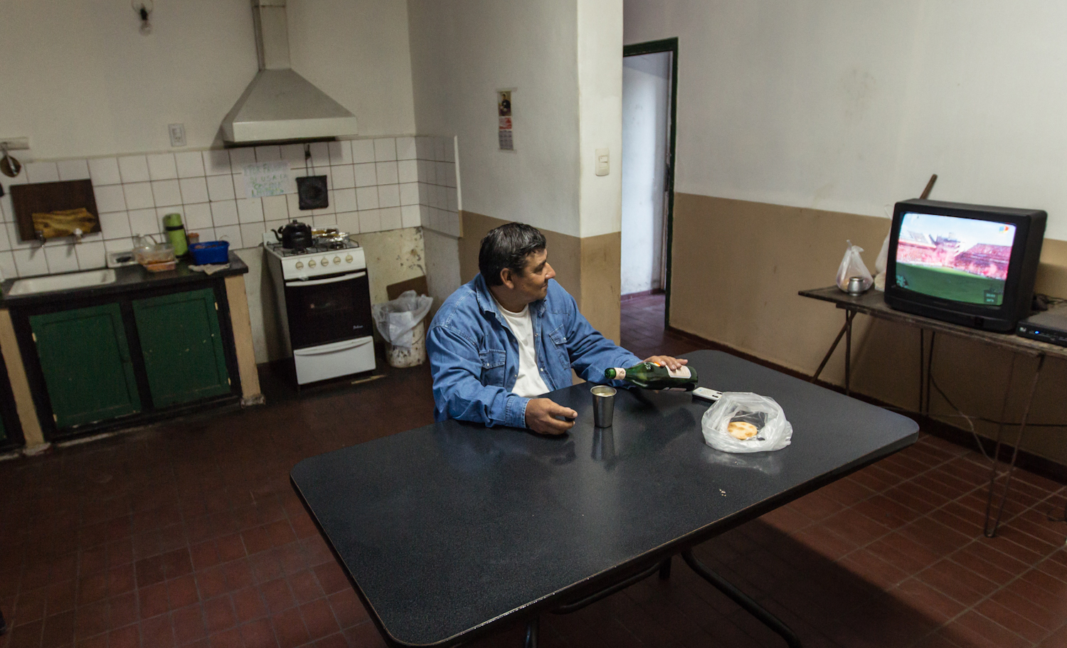 Alejandro bebe Fernet mientras disfruta de un partido del River Plate contra Tigre.