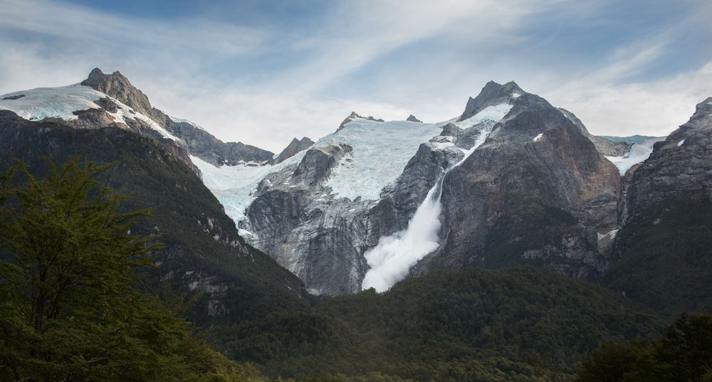 Es el valle más bonito por el que he tenido la oportunidad de caminar. 52 kilómetros de camino de ripio te conducen entre lagos de agua impoluta, paredes de granito que cortan con cientos de metros verticales los impenetrables bosques de árboles e innumerables glaciares agrietados que coronan las montañas con colores blanco y azul turquesa, hasta la entrada del glaciar Exploradores. Desde el Monte San Valentin, el más alto de la Patagonia, se deja caer esta masa de hielo que colorea y da forma a las faldas de esta montaña de casi 4000 metros de altura.