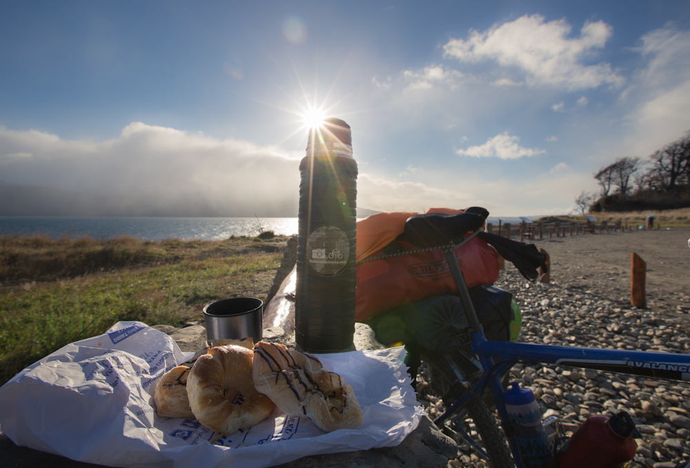Saliendo de Tolhuin hago un alto en el camino para comerme los bollitos que me dieron para el camino y beber un té calentito. Son los últimos rayos de sol que tendré en unos días…