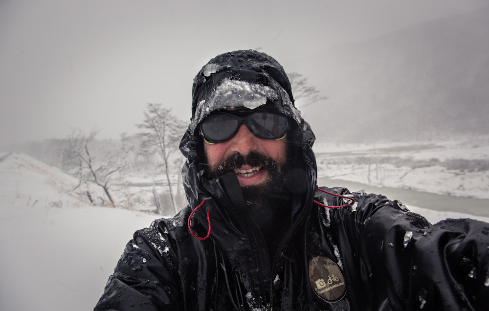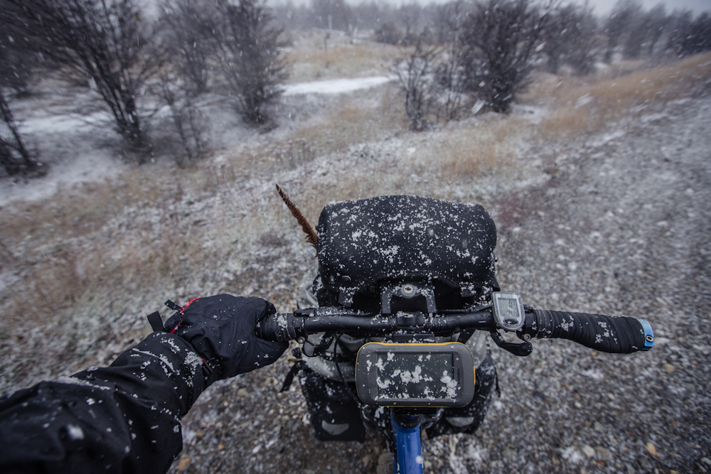 Los copos de nieve cada vez se están haciendo más grandes y cuando me quiero dar cuenta, está todo blanco. El viento a estado en mi contra todo el trayecto, lo que me ha hecho tener que pedalear con suma paciencia, pero ahora que está nevando tan intensamente, me hace muy difícil avanzar. Los copos de nieve se meten por todos lados. Al respirar se meten por la nariz, si mueves la cabeza se meten por el cuello, si levantas a mano para estirar se te meten por el brazo, y si se te sube el pantalón impermeable se te meten por dentro de las zapatillas. Pedaleo estático, con la cabeza baja y mirando a tan solo 1 metro por delante de la rueda, al principio puedo intuir a raya del arcén que me sirve de referencia, después todo se queda blanco.