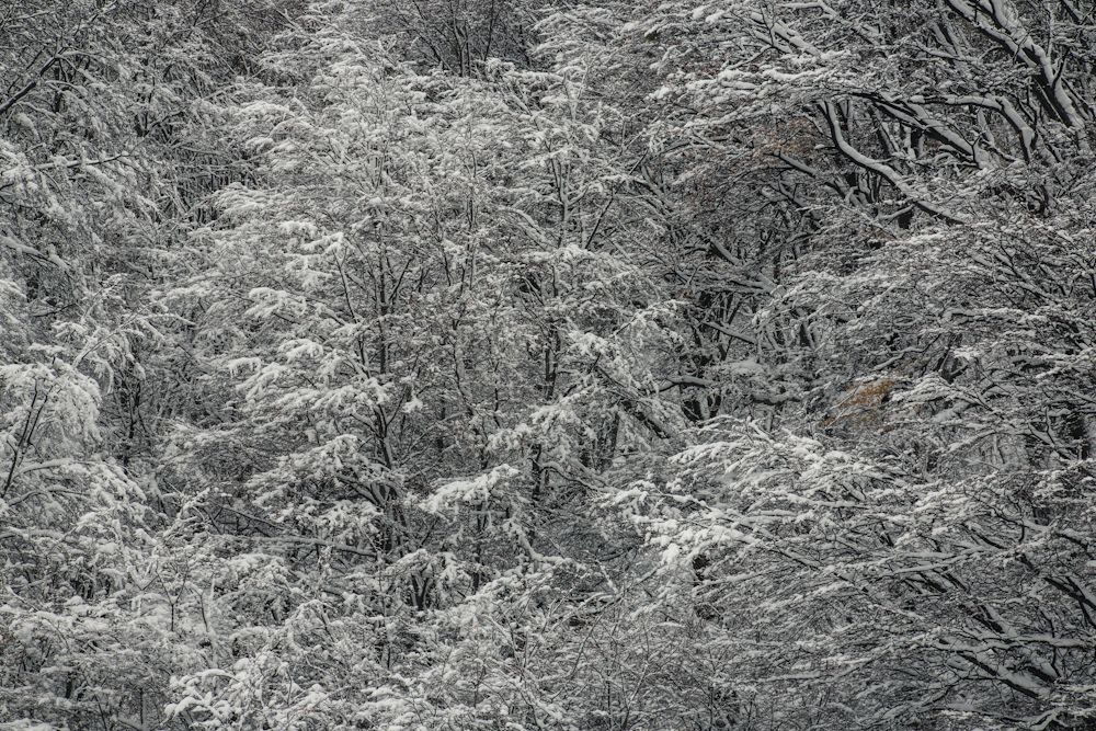 Oigo el agradable crujir de la nieve bajo las ruedas, nada más. Es el hechizo de la nieve, el silencio. Dibuja el paisaje uniforme y silencia el espacio. Pedaleo entre los copos que suavemente flotan en el aire, se posan, y siguen cayendo sin molestar. Voy avanzando kilómetros sin darme cuenta, estoy demasiado entretenido con el camino como parar a pensar si estoy cansado o no, y cuando me quiero dar cuenta, llego al alto del puerto Garibaldi. No me detengo, el calor que he ido acumulando durante la subida pasaría a ser frío en cuestión de minutos, y además, está todo cubierto como para poder disfrutar de las vistas de los valles y montañas que me rodean. Continuo.