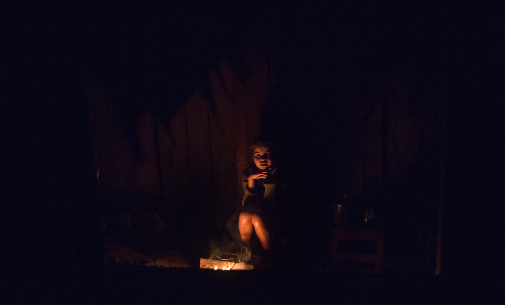 Salgo a ver las estrellas, y de pronto por una ventana me encuentro esta escena. La hija se encuentra sola mirando al fuego pensativa, cuando me ve, me mira a cámara con toda la paz del mundo