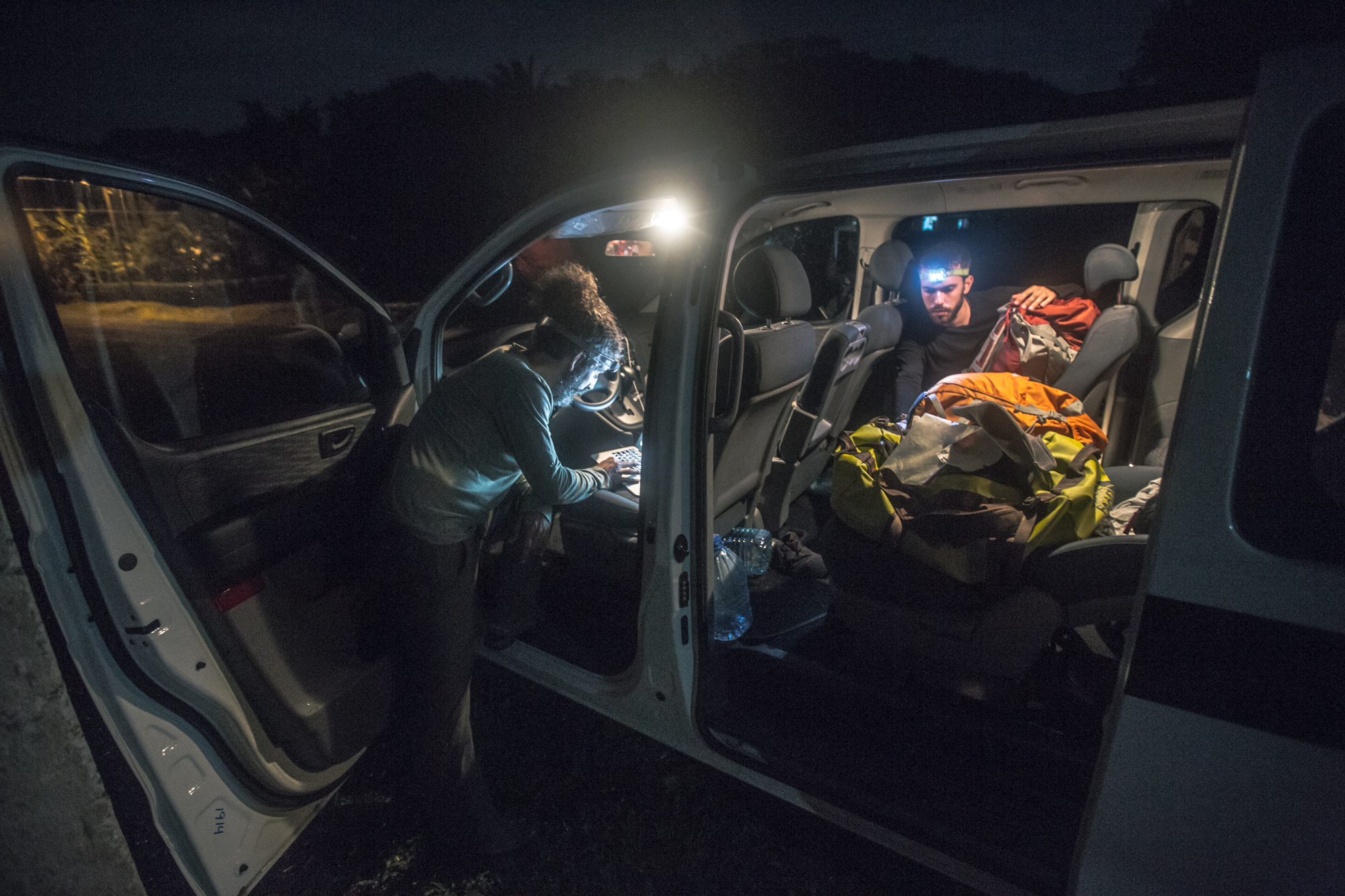 Mi aislante de dormir es perfecto para usar de reflector en las entrevistas. Mientras lo guardo Alvaro me muestra el magnifico audio grabado. Photo: David Oliete.