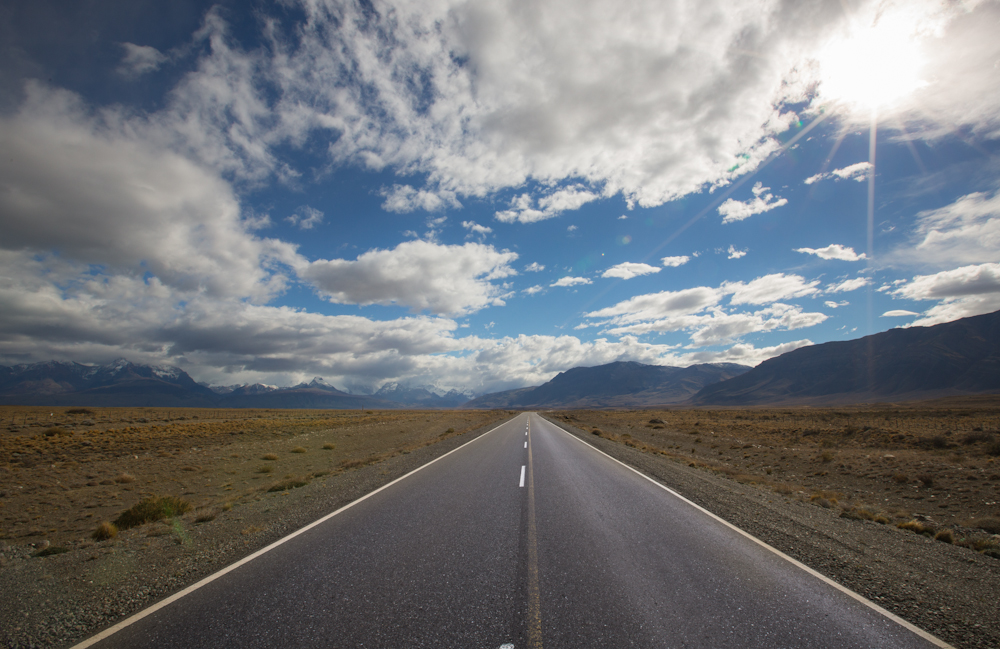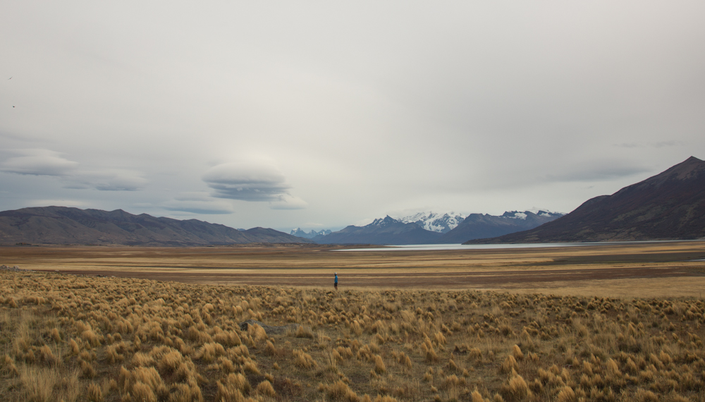 Para llegar hasta aquí le di la espalda a las montañas de El Chaltén y pedaleé por la pampa durante 220km. 220km de paisajes infinitamente amarillos hasta cortarse con el azul del cielo, o con el gris de las nubes. Pedaleas hasta que estas cansado o la noche se te va a echar encima y paras a poner la carpa a la vera de la carretera ya que ambas partes del camino están completamente valladas y no te permiten alejarte mucho del tránsito. Pero estamos fuera de temporada y por la noche no pasa ningún coche.